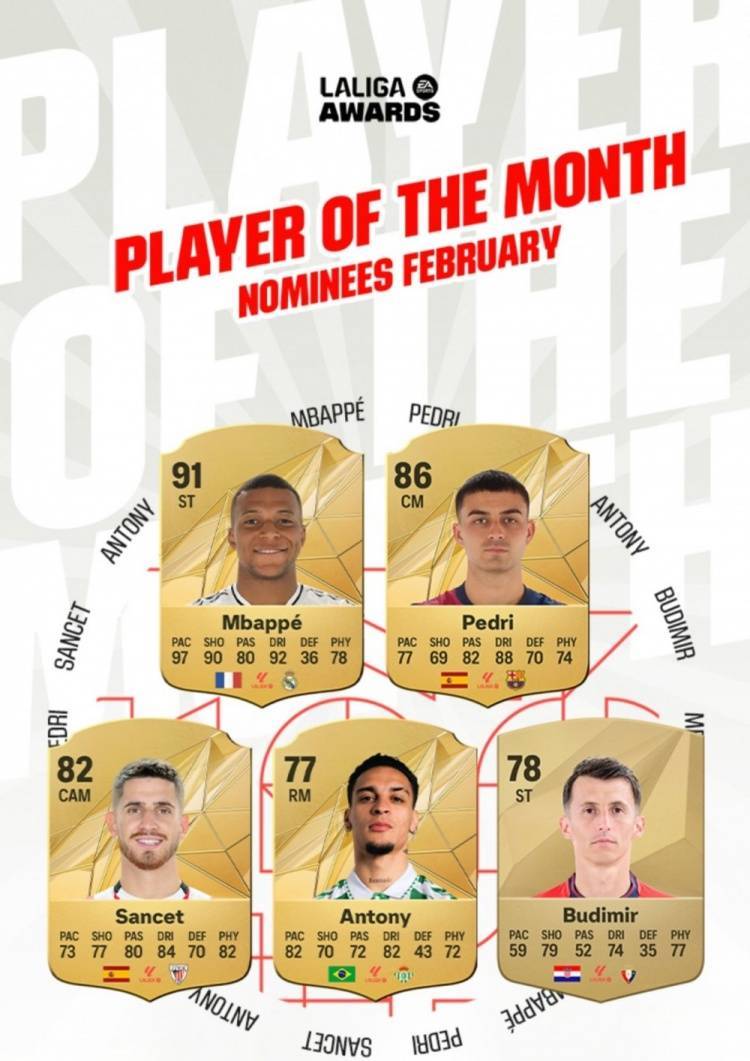 直播吧2月20日讯 西甲官方公布了2月份最佳球员的5人候选,姆巴佩、佩德里、安东尼入围。在2月份,西甲还有第25轮比赛未进行。