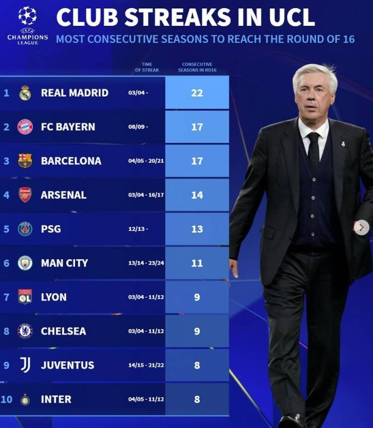 直播吧2月21日讯 皇马在本轮欧冠附加赛双杀曼城,成功挺进欧冠十六强。《转会市场》也统计了欧冠历史最长连续晋级十六强榜单。